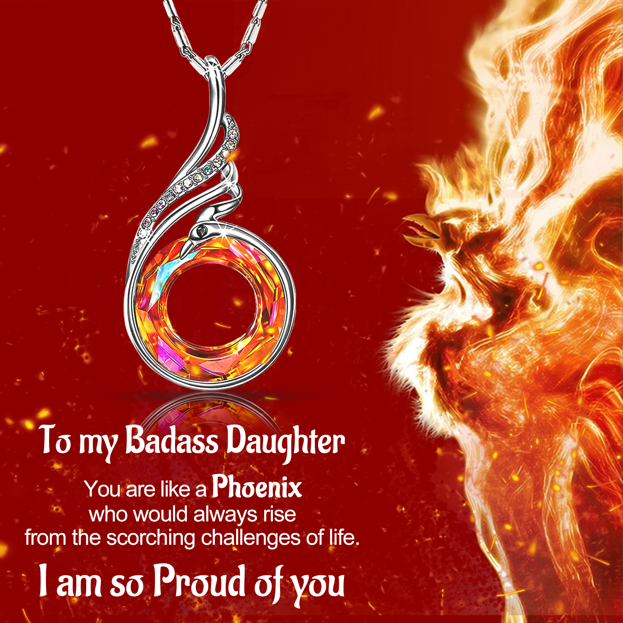 Our phoenix necklace represents inner strength. Whenever your daughter wears this necklace, she can feel the energy and power and gains strength to keep going through the toughest times.